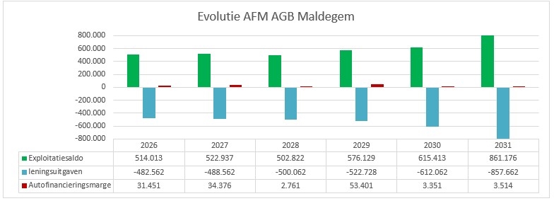 In 2031 zijn er geen bankleningen meer in het AGB, en zijn er alleen nog openstaande leningen ten aanzien van de gemeente. Als men de totale schuld van het lokaal bestuur Maldegem bekijkt, dan mag men deze intra-company leningen (toegestane renteloze leningen) niet meenemen om de totale schuld te analyseren.
