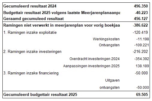 Op basis van deze elementen werd het gecumuleerd budgettaire resultaat voor 2025 geactualiseerd naar 69.505 euro, tegenover de eerder voorziene 456.127 euro.