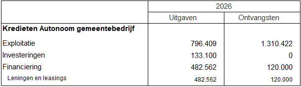Dit schema geeft per budgettaire entiteit de kredieten weer voor de uitgaven en de ontvangsten. Het is op dit niveau dat de kredietbewaking van belang is. Indien één van die cijfers zou moeten wijzigen, dan is een aanpassing van het meerjarenplan nodig. De kredieten van 2026 worden zoals in onderstaande tabel vastgesteld.