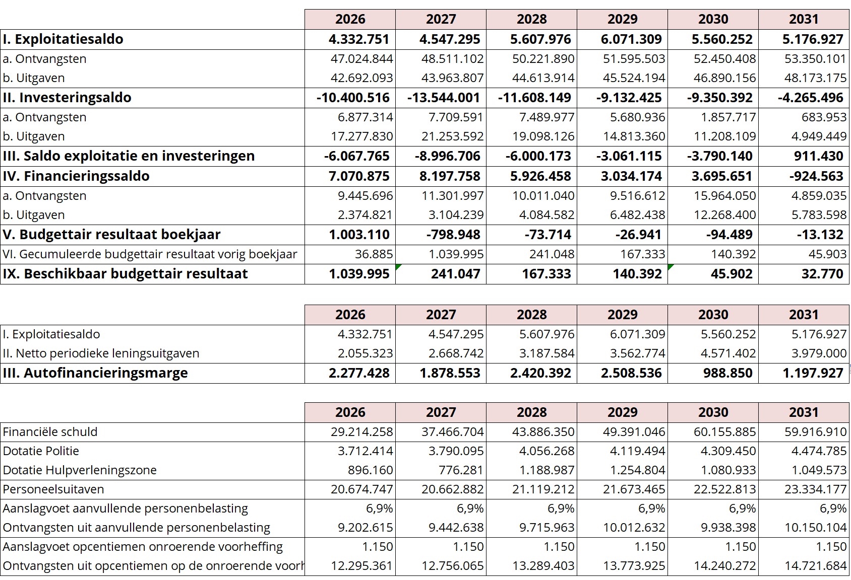 Dit meerjarenplan is gebouwd op duidelijke principes. Als bestuur nemen we onze verantwoordelijkheid: we voeren onze kerntaken kwalitatief en met hart en ziel uit. Tegelijk zetten we de middelen zo efficiënt mogelijk in. We kiezen resoluut voor een gezond financieel beleid gekoppeld aan een ambitieuze investeringsagenda die de gemeente vooruit duwt. Om deze ambitie waar te maken, is een bijsturing van de fiscale inkomsten onvermijdelijk. We raken bewust niet aan de aanvullende personenbelasting. We passen wel de opcentiemen op de onroerende voorheffing aan van € 1.039 naar € 1.150. Deze beslissing is geen vrijblijvende keuze, maar een noodzakelijke en weloverwogen stap om de financiële druk waarmee lokale besturen vandaag geconfronteerd worden, het hoofd te bieden.