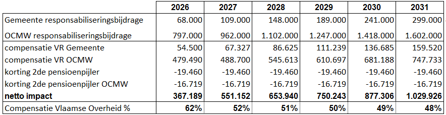 De geraamde responsabiliseringsbijdragen van augustus 2025 zijn opgenomen in het meerjarenplan, alsook de aangekondigde financiering van 50% door de Vlaamse regering. Ook werd rekening gehouden met de korting die besturen krijgen indien ze een tweede pensioenpijler van minimum 3% geven aan contractuele medewerkers.