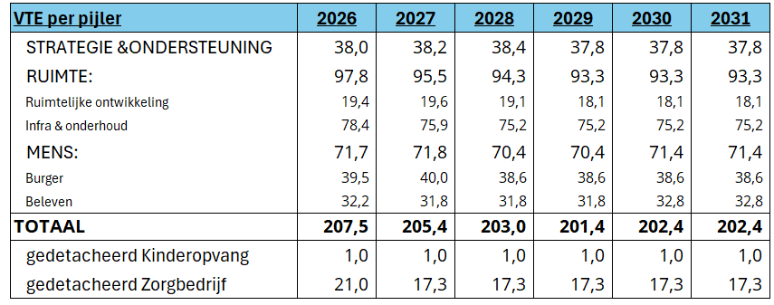 Het organogram werd grondig geanalyseerd en bijgesteld. Hierbij werd het uitgangspunt van een slanke en performante organisatie gehanteerd. Dit resulteert in het niet vacant verklaren van enkele geplande aanwervingen. Daarnaast werd ook een besparing uitgevoerd op de personeelsbezetting voor de komende legislatuur, waarbij er o.a. telkens werd geëvalueerd of een medewerker die met pensioen gaat moet vervangen worden. Hierdoor werd een bijkomende besparing van ongeveer 6 VTE gerealiseerd. Vanaf de opening van het nieuw cultuurcentrum wordt in 2030 een theatertechnicus aangeworven.
