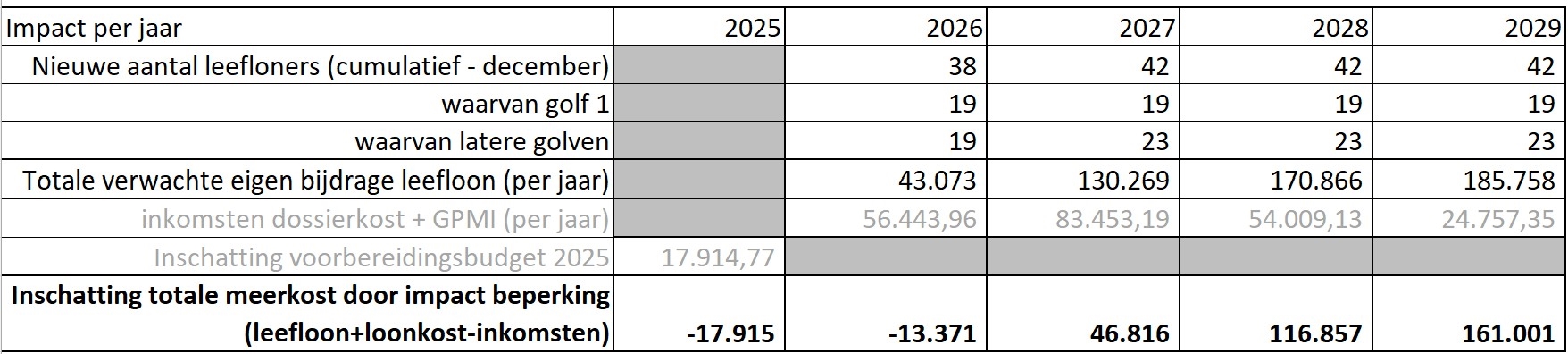 Deze impact werd opgenomen in de cijfers. De totaal verwachte eigen bijdrage is het verschil tussen de kost van het leefloon en de verkregen subsidies van de federale overheid.