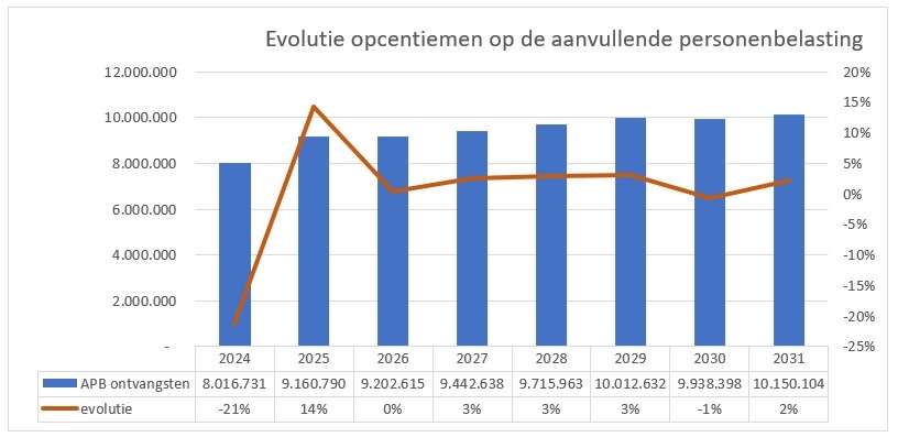 De bedragen opgenomen in het meerjarenplan voor de aanvullende belasting op de personenbelasting stemmen overeen met de ramingen ontvangen van de federale overheidsdienst in oktober 2025. De impact van de federale maatregelen op de personenbelasting werden mee opgenomen. Dit verklaart de daling 2030.