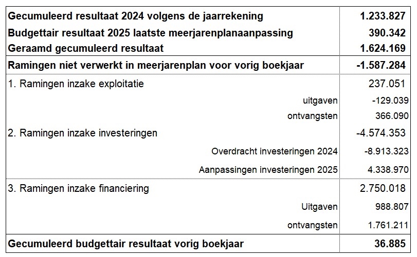 Op basis van deze elementen werd het gecumuleerde budgettaire resultaat voor 2025 geactualiseerd naar 36.885 euro, tegenover de eerder voorziene 1.624.169 euro.