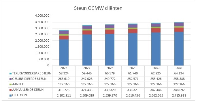 De onderstaande tabel toont de verwachte evolutie van de steun die uitbetaald zal worden aan OCMW-cliënten per type steun.