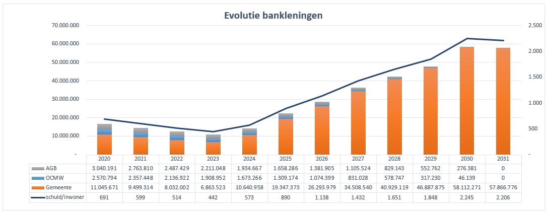 Doordat er heel wat bestaande leningen aflopen in 2030-2031, daalt de openstaande schuld in 2031, niettegenstaande de aflossingen van de nieuwe leningen, waardoor de opmaak van het daaropvolgend meerjarenplan 2032-2037 onder een gunstig gesternte van start kan gaan.