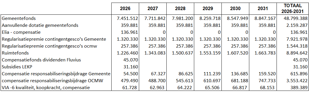 De Elia-compensatie wordt gehalveerd in 2026 en verdwijnt vanaf 2027 helemaal. De Vlaamse subsidie ter compensatie van dalende energie-dividenden, alsook voor LEKP (Lokaal Energie en Klimaat Pact) doven ook uit.