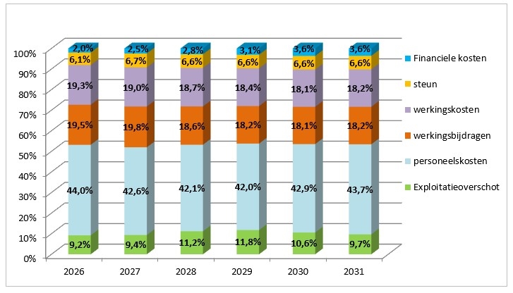 Onderstaande figuur toont de diverse exploitatie-uitgaven t.o.v. totale exploitatie-ontvangsten en de evolutie over de zes jaren.