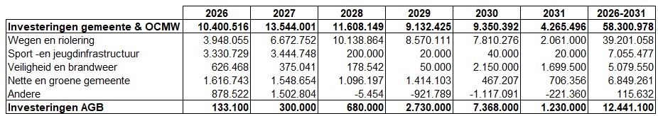 De spreiding van de investeringen over het meerjarenplan van de gemeente en het OCMW ziet er als volgt uit: