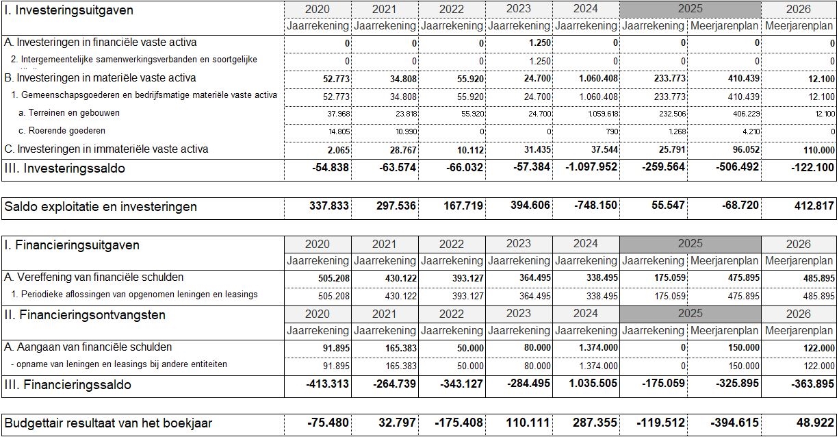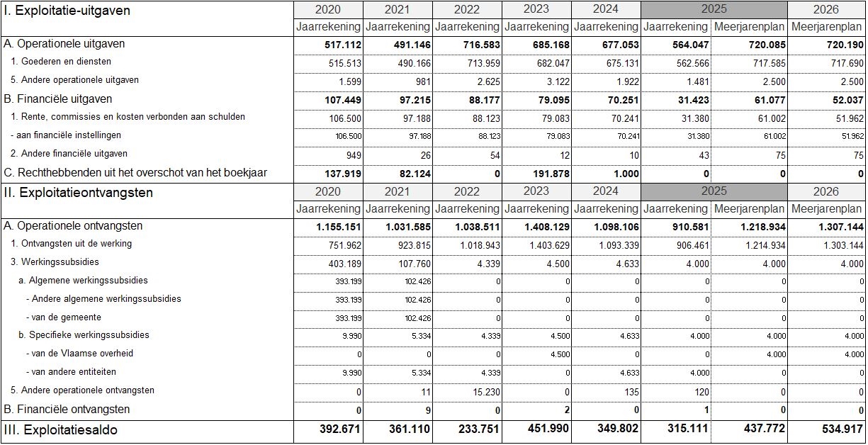 De cijfers opgenomen in de kolom meerjarenplan (=budget) zijn deze volgens laatst goedgekeurde kredietverschuivingen. De kolom jaarrekening betreft het totaal van gerealiseerde uitgaven en ontvangsten, geboekt tot en met augustus.